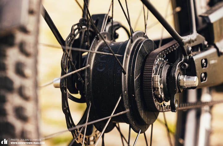 Enviolo gearing with carbon belt drive. The drivetrain combination of enviolo and belt drive is simple to use, low maintenance and tough. With a simple twist shift and large 380 degree continuous range of gears Enviolo is easy to use and has the added benefit of being able to change gears whilst stationary.