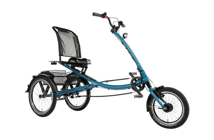 The Pfautec Scooter electric trike is the hub-drive version of the Pfautec Scoobo e-trike. It is a strong, versatile and easy-to-use e-tricycle that offers exceptional stability thanks to the differential transmission that works in harmony with the rear suspension. It has easy-to-use 7-speed internal gears, also a reversing gear for easy manoeuvring and a handy parking brake. Like the Scoobo it is comfortable thanks to its coil suspension seat and and is easy to adjust its set up for optimal ergonomics. The Scooter trike is the ideal machine if you want a more economical version of the Scoobo.